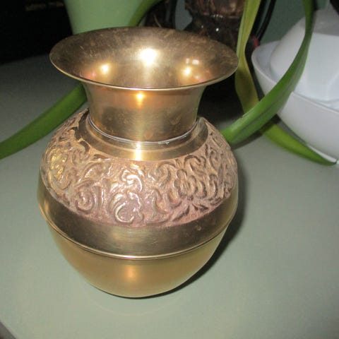 Messingvase, Vintage, med emalje trykk. Usikker på opprinnelsen. 18cm høy. De 2 siste bildene i annonsen så er vasen pusset.