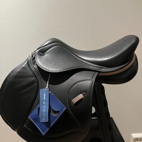 Selger en helt ny Ikonic sprangsal i svart lær. Den har et halvt dypt sete. Den er 17.5 i setet. Den er nå medium i bomstørrelse. Fordelen med disse salene er at man kan skifte ut bommen selv.