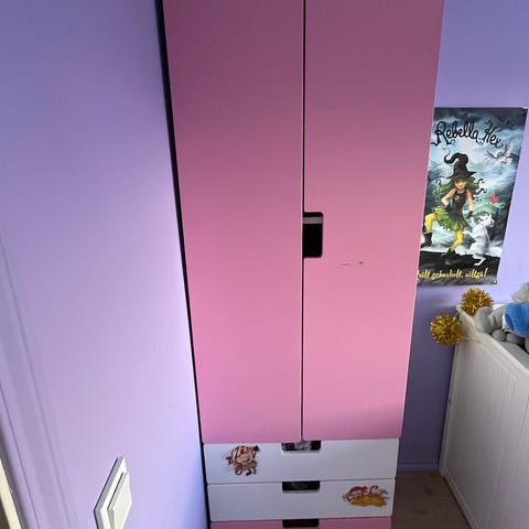 IKEA barneskap med rosa dører og hvite skuffer. Skapet har to dører med håndtak, hylle, klesstang og to skuffer under. Passer til oppbevaring av barneklær eller leker.