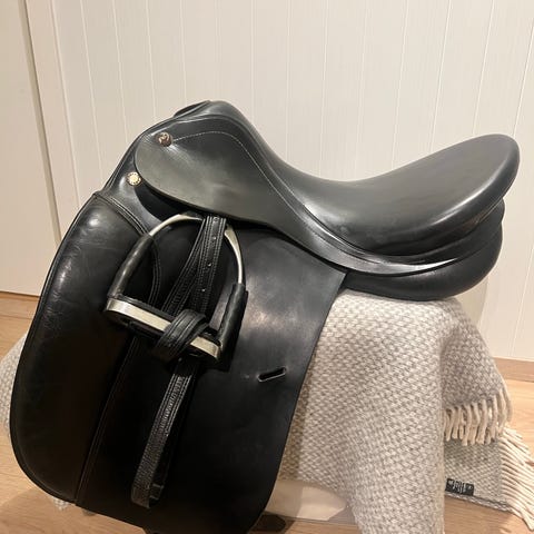 Prestige Appaloosa Dressursal laget av svart lær. Dressursal 17 i setet, og er medium-vid bom i. Veldig god sal og sitte i, som ikke låser deg som rytter helt. Sprenger stigbøyler og stigbøyle reimene kan følge med salen☺️ seriøse bud mottas!