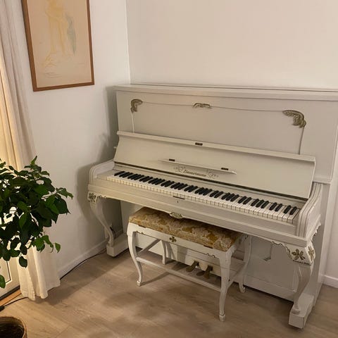 F. Hellstrøm piano i hvit farge gis bort. Må stemmes før bruk.