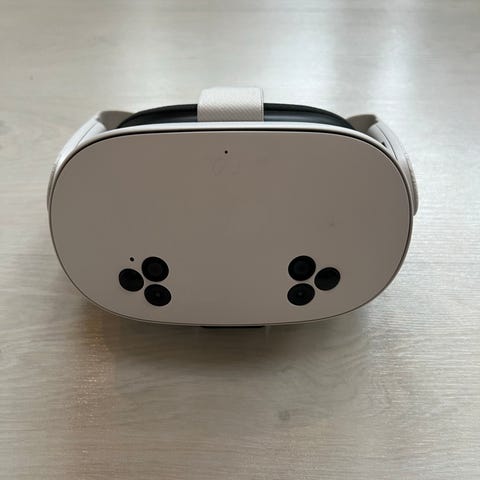 Sony PlayStation VR headset med tilhørende kamera. VR-headsettet har svart og hvit farge, designet for bruk med PlayStation-konsoller, kan også brukes på PC. Kameraet er svart og kobles til konsollen for bevegelsessporing og interaksjon i VR-spill. Fungerer som det skal. Pris kan diskuteres