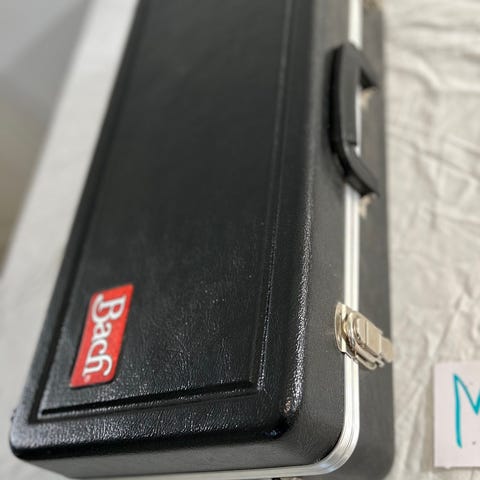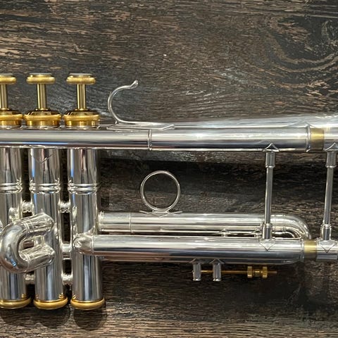 Trompet i messing. Originalt, ubrukt munnstykke følger med. Leveres med etui for oppbevaring og transport, samt vedlikeholds-kit.