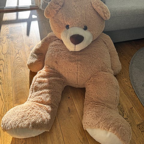 Stor, myk og fin teddybjørn selges. 240 cm høy med stor kosefaktor.