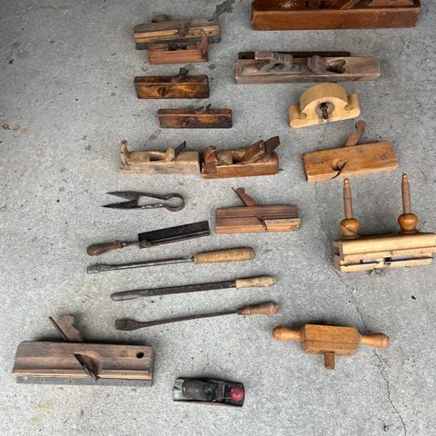 Håndlaget treskjærerarbeid håndhøvel i tre med dekorative utskjæringer og malt overflate. Verktøyet er laget for hånd og viser tegn på bruk og alder.