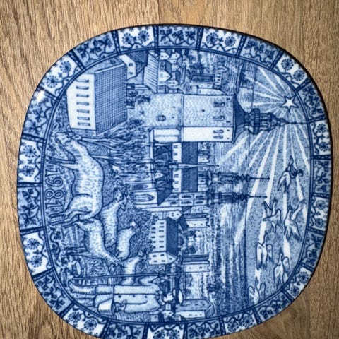 Rörstrand Julen dekorative fat fra 1980 og 1985. Fatene har blått mønster med julemotiv og er produsert i porselen. Passer til samling eller dekorasjon.
