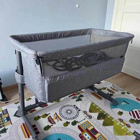 Nesten ny, ikke brukt så masse. Bedside crib i god stand. Tova bedside crib lar babyen sove trygt helt inntil deg, slik at nattamming og trøst går enklere. Sengen trilles på plass ved siden av foreldresengen, festes med medfølgende bånd og kan justeres i fem nivåer for god tilpasning. Den nedfellbare langsiden gir nærhet uten løfting over kant, og de luftige mesh-panelene gir både innsyn og god ventilasjon. Når dere skal bort eller vil rydde den bort, foldes den raskt sammen og legges i transportbagen.