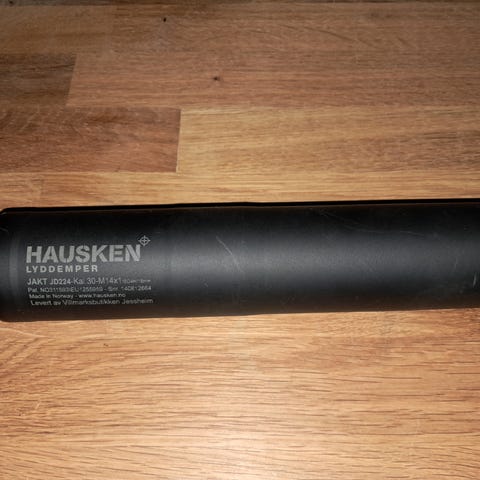 Hausken JD184 lyddemper selges. Veldig lite brukt, ingen bruksmerker. Ny i oktober 2024. Stått på en 8x57 pipe. Maks skutt 50 skudd. 15x1 gjenge.