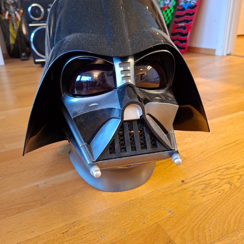 Star Wars Darth Vader maske med ulike lyder. Har stått pent på en hylle. Vil tro dette er et samleobjekt? Sender helst ikke med Helt Hjem pga mye tyverier i området.