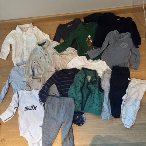 Selger en klespakke i str 68-74. Det blå settet er fra Reflex og er i bambus, super mykt og godt. Overdelen er i 74, underdelen i 68. Den mørkeblå buksen er ull fra Reflex i str 68.