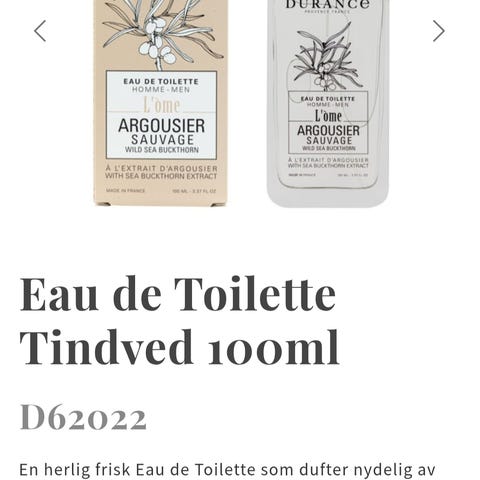 En herlig frisk Eau de Toilette som dufter nydelig av Tindved. En duft av aromatiske og skogsdekkende urter, kombinert med et hint av frisk tindved. For den SPORTY & FRESHE mannen, som liker å være på farta.