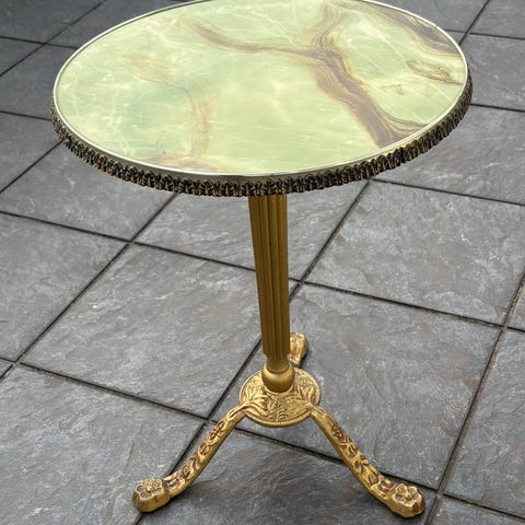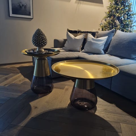 Bord med glassplate, høyde 46 cm, bredde/lengde 75 cm x 75 cm.