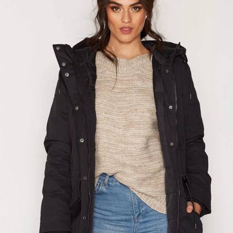 Parkas med coatad (belagt) overflate og fôr i myk fuskepels. Quiltet, vevd fôr i ermene og nederst.