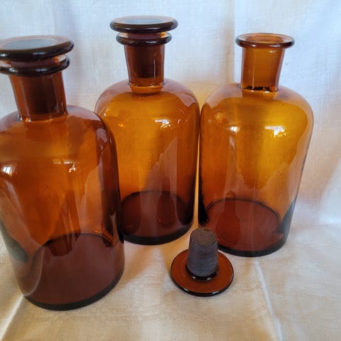 To gamle apotek glassflasker uten kjent merke eller modell. Den ene flasken har målemarkeringer opp til 100 ml. Begge flaskene er gjennomsiktige og laget av klart glass. Passer til oppbevaring av væsker eller som dekorative gjenstander.