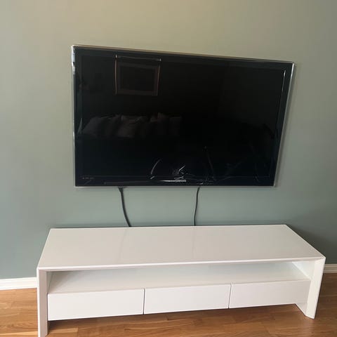 Hvit tv-benk i massivt tre GIS BORT. Vintage look. Har noen få bruksmerker, se bilde.