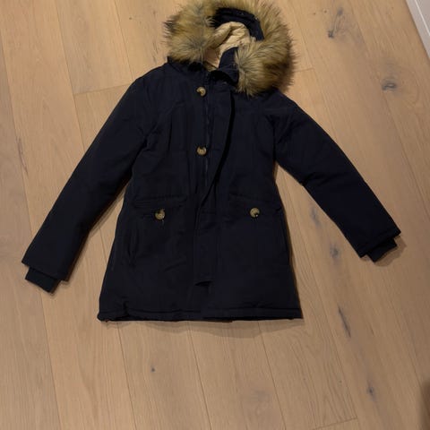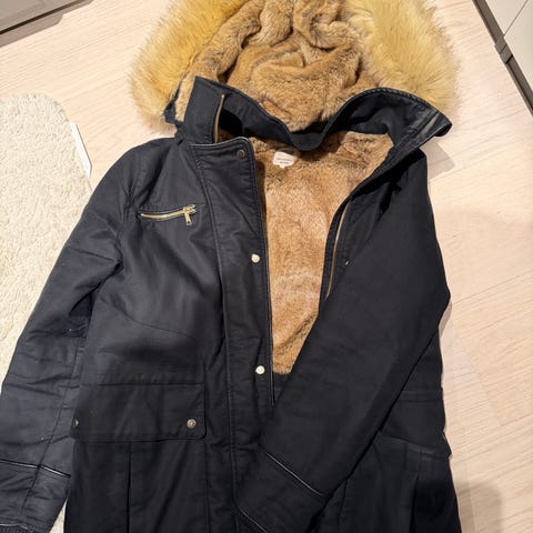 Tidløs jakke med teddy for og fuskepels inni hetta. Helt ny med tag, kun prøvd på