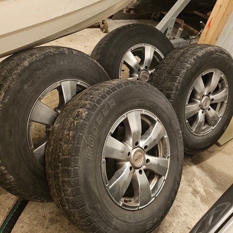 Hjul som fulgte min Tahoe. Felger malt svarte innvendig. Forstår eg rett, er dette max tillatt størrelse (4.9% større enn orginal hjul) Alle centerkopper er med. Pene hjul, men eg sjanser på kjøpe større til sommeren. Bud ønskes. Kan muligens hjelpe med frakt... 4 vinterdekk orginal dim kan følge med.