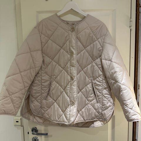 H&M Vinterjakke i størrelse L for kvinner. Jakken er beige og laget av polyester. Den har hette og lommer, og er designet for vinterbruk.