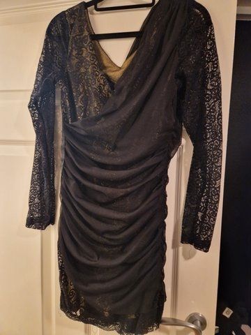 Nydelig festkjole glatt champagne farget stoff. Kjole med lange ermer og skjerf. Pris var 599kr