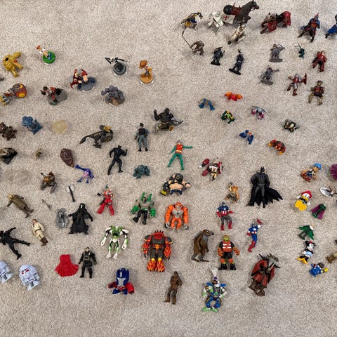 Blandet samling av actionfigurer i ulike størrelser og farger. Figurenes materialer og spesifikke merker er varierende. Egnet for samlere eller lek.