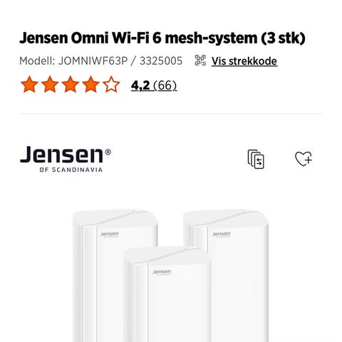 Selger 6 stk Jensen Omni Wi-Fi 6 Lite mesh-enheter. Alle fungerer helt som de skal og gir stabil og rask Wi-Fi 6-dekning i hele huset. To av enhetene er litt misfarget i plasten etter lagring, men dette påvirker ikke ytelsen.