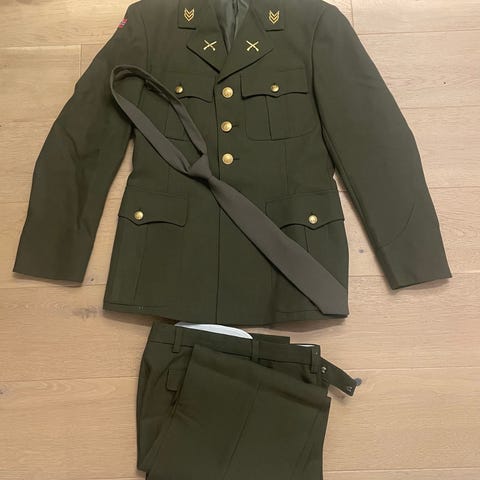 Norsk militær uniform ull, merkene på den antyder sersjant. Buksa ser ikke ut som er brukt en eneste gang, men jakka kan ha vært brukt, de er begge fra stormarka konfeksjoner. Str på jakka er 50 normal.