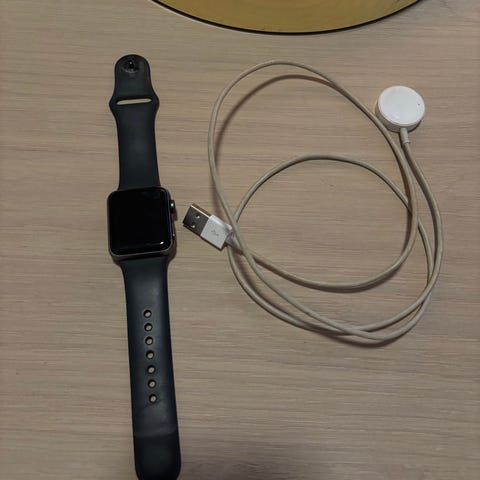 Brukt Apple Watch Series 3 i den store størrelsen (42 mm), farge stellargrå/sort. Skjermen har noen riper, men er ikke knust. Klokken fungerer ellers helt fint.