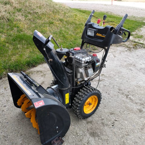 Mcculloch snøfreser med Briggs bensinmotor, totrinns system, og hjul for enkel manøvrering. Maskinen har gule skraper og svart chassis, egnet for effektiv snørydding på mellomstore områder.