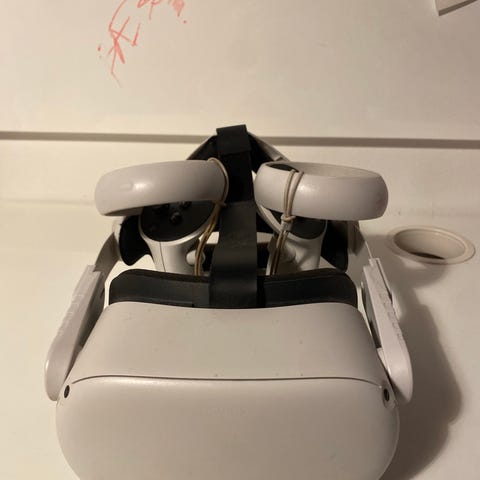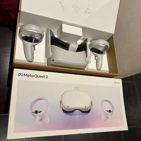 Selger et fint brukt Meta Quest 2 VR-headset med to kontrollere. Produktet kommer i original emballasje og inneholder nødvendig tilbehør for bruk.