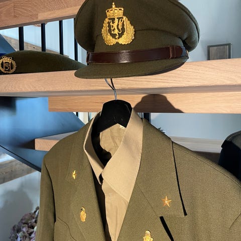 Dette er en norsk militær uniform av grad sersjant. Det følger med en jakke, en bukse og ett slips. Str 48 kort.