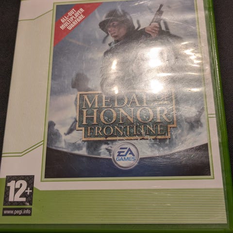 Medal of Honor Frontline Xbox-spill. Spill i original Xbox-utgave, inkludert spilldisk og originalt spillomslag. Passer for Xbox-spillere, anbefalt aldersgrense 12 år og oppover.
