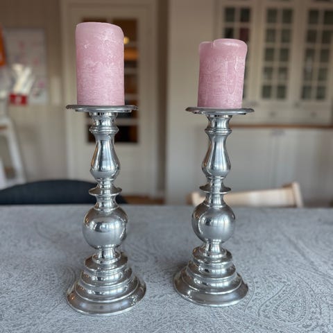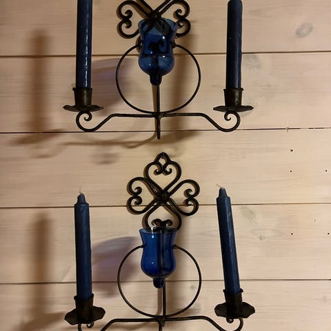 Selger 2 stk lysestaker i metall til å henge på vegg.