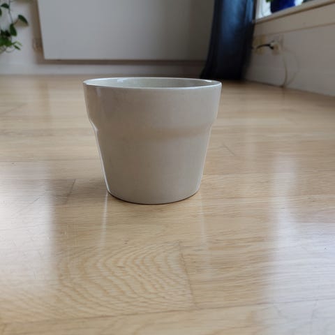 Hvit keramisk blomsterpotte med en diameter på ca 15 cm.