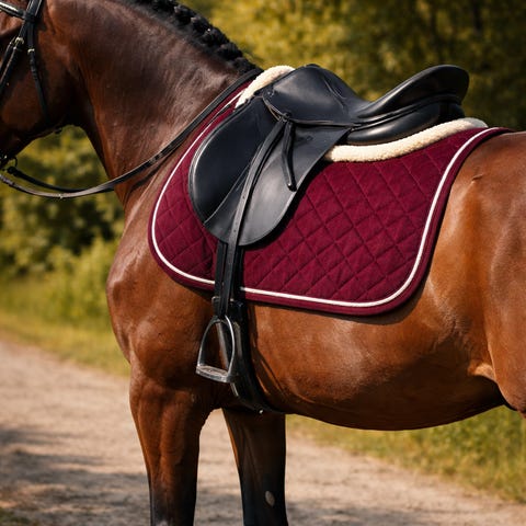 Equestrian Stockholm Salgunderlag i blå velour med geometrisk quiltet mønster og dekorative detaljer i gullfarge. Salgunderlaget er designet for bruk under ridning for å gi komfort og beskyttelse til hesten.