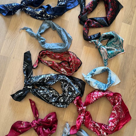 Nye silkeskjerf til bunad og festdrakt. Materialet er 100%silke og er sydd av meg. Måler omtrent 65x65. Samme størrelse som Tyrihans sine skjerf. Skjerfene som er avbildet er klare til levering. Siste bilde er noen farger jeg enda ikke har rukket å sy opp, men som kan være klare løpet av noen dager om du ønsker☺️ Kan hentes i på sthashaugen i Oslo eller sendes med posten:)