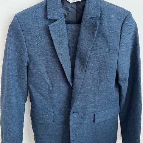 Selger en fin mørkeblå dress i str. 152 som har blitt brukt noen få ganger. Den er veldig fin, men har fått et lite felt på kneet som er litt lysere i stoffet (se bilde). Ikke veldig synlig, mest i rett lys.