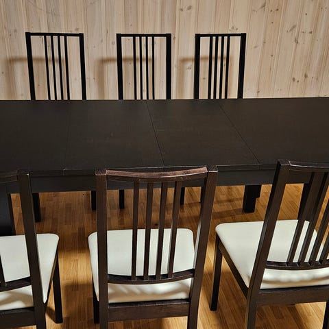 Fin spisestue inkl. 8 stoler. Se mål på det ene bildet. Ny pris ca 8-9000.