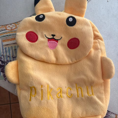 Pokémon Pikachu plysj-veske/myntholder. Ca. 25 cm bred og 30 cm høy (opp til ørene). Kjøpt i Japan, men aldri brukt.