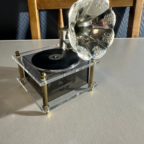 His Masters Voice - sveivegrammofon - HMV 88 blå - fra ca. midten av 1930-åra. Sjelden reisegrammofon i blå farge. Dene modellen, HMV 88, er en i vekt, lettere modell enn de øvrige HMV'ene som ble solgt på samme tid - dette slik at den skulle være lett å ta med seg på piknik i parken. Den har noe overflateslitasje/rynker etter årenes løp, men grei stand alder tatt i betraktning. Når den trekkes opp, så begynner tallerken å spinne, men fjæra "slipper", så den lar seg ikke trekkes ordentlig opp. Antar at dette kan være en grei sak å fikse for den kyndige. Selges as is. MÅ HENTES I TRONDHEIM.