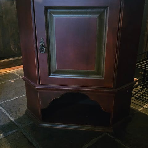 Sortmalt (matt) hjørneskap med litt malerester på glasset . Går sikkert bort med whitesprite (som jeg ikke har hjemme)