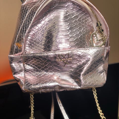 Victoria's Secret ryggsekk laget av andre materialer i rosa velour. Designet for unisex bruk, med polstret og quiltet mønster samt justerbare skulderstropper.