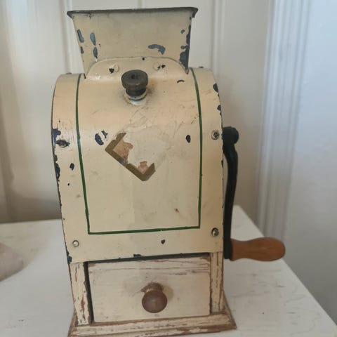 Gammel kaffekvern med justerbar grovhet. Denne kommer mest trolig fra en butikk/landhandel. Antakelig fra 60-tallet. Ikke testet, men ser ut til å være komplett og hel. Åpen for bud. Link til tilsvarende kaffekvern på museum: https://digitaltmuseum.no/021028270747/kjokkenutstyr