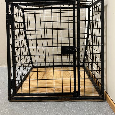 Metallbur til kjæledyr med en dør og bunnteppe. Burens struktur er laget av metalltråd, og det er designet for å gi sikker oppbevaring av små til mellomstore kjæledyr.