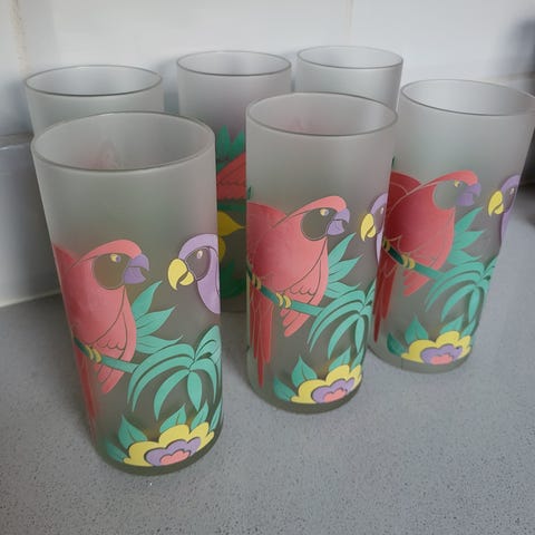 Retro, fargerike glass med papegøye.