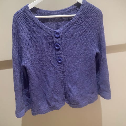 Blålilla cardigan. Uten merkelapp, derfor usikker på materialet. Romslig størrelse. Med knapper.