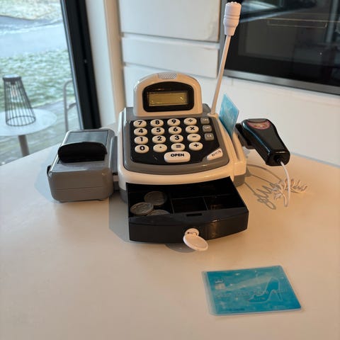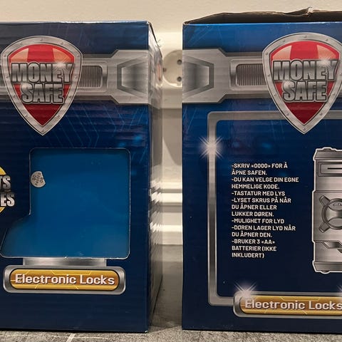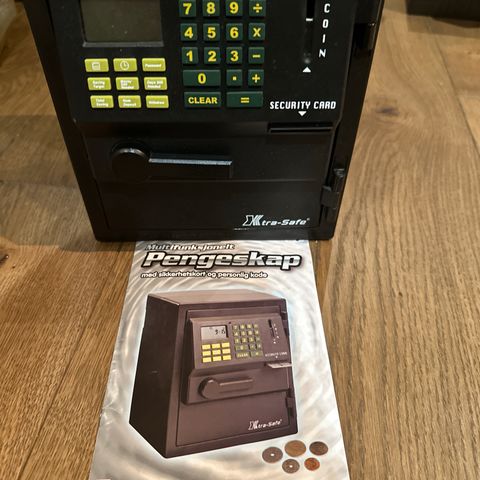 Pent brukt pengeskap med kode. Den leser alle norske mynter automatisk, slik at den teller hvor mye du har spart.
