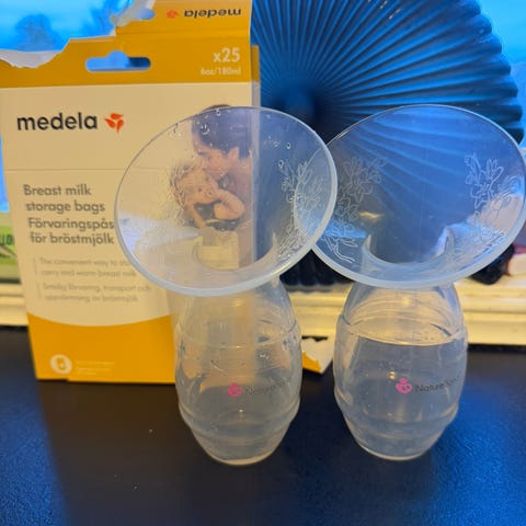 En pakke med naturebond, flasker, ammeinnlegg i bomull og ull.