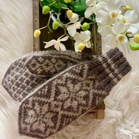 Grå selbuvotter i ull, passer damehender