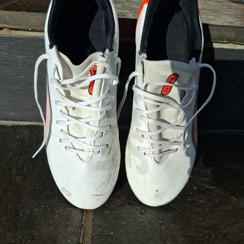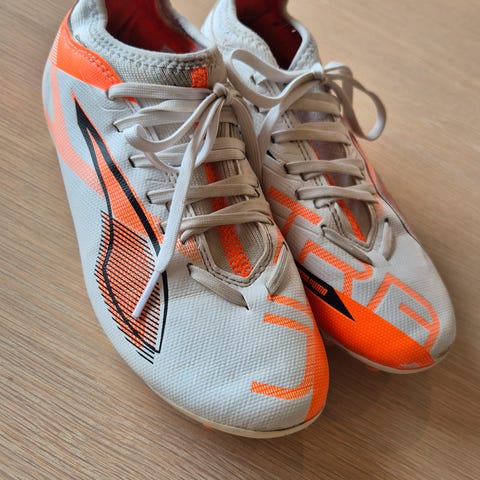 Puma Ultra 5 Ultimate AG fotballsko i størrelse 43, fargene hvit og oransje. Skoene har knotter tilpasset kunstgressbaner (AG). Materialet og designet er laget for fotballspillere som trenger grep og komfort på kunstgress.