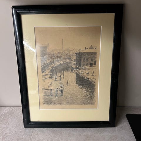 Innrammet kunsttrykk som viser et gårdsinteriør med trebygninger. Trykket er i svart-hvitt med detaljerte tegninger av arkitektur og omgivelser. Passer til dekorasjon i hjem eller kontor.